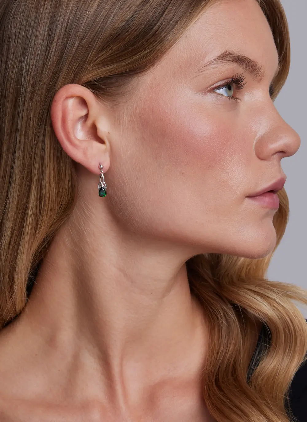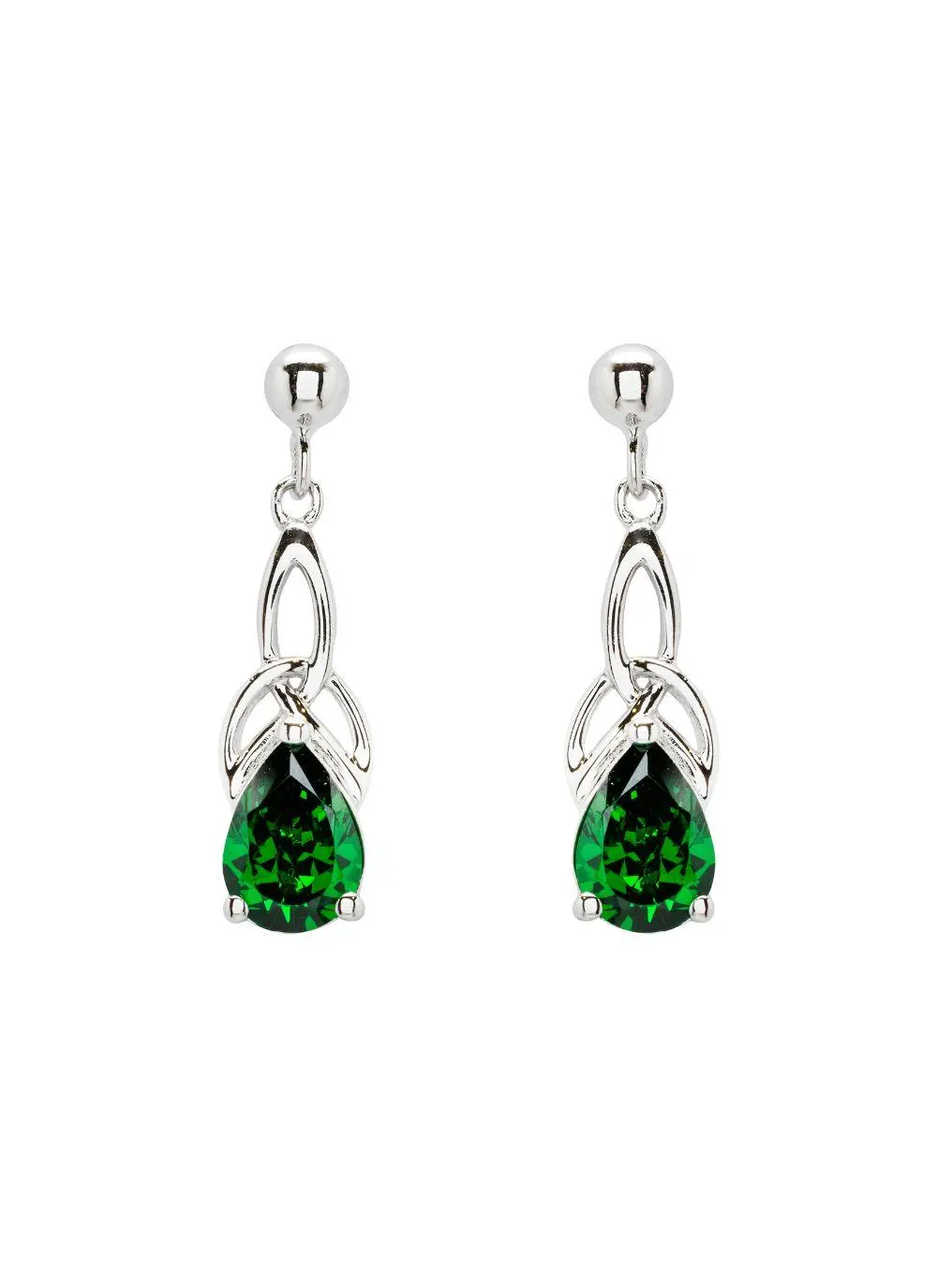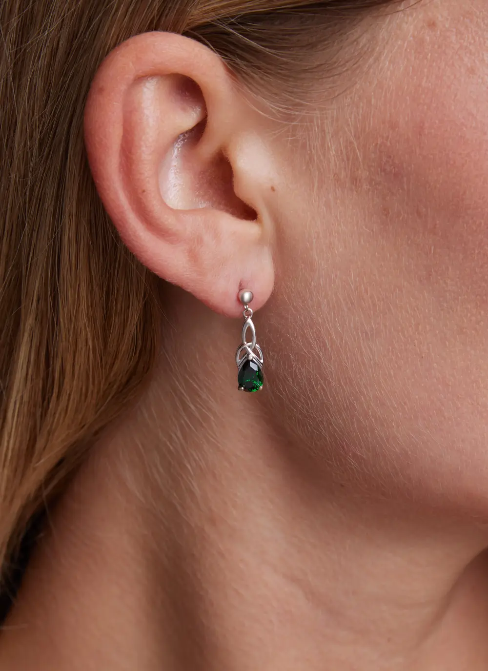 Sterling Silver Trinity Knot Drop Earrings with Green Stone