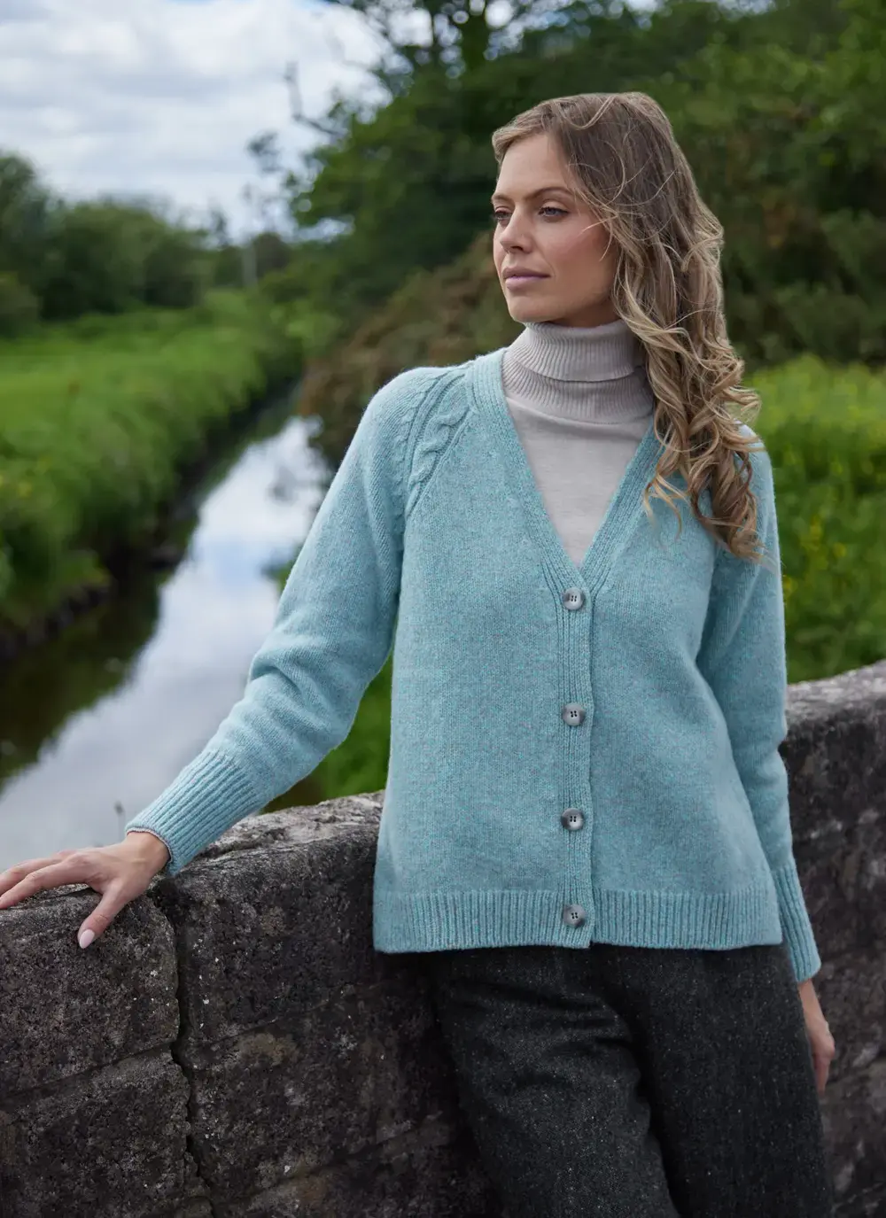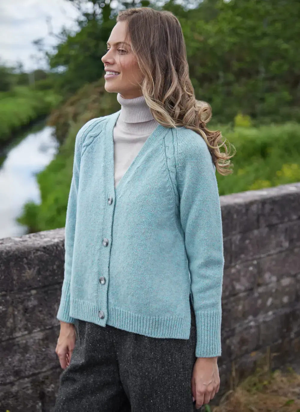 Fisherman Cashmere Raglan Cable V-Neck Cardigan