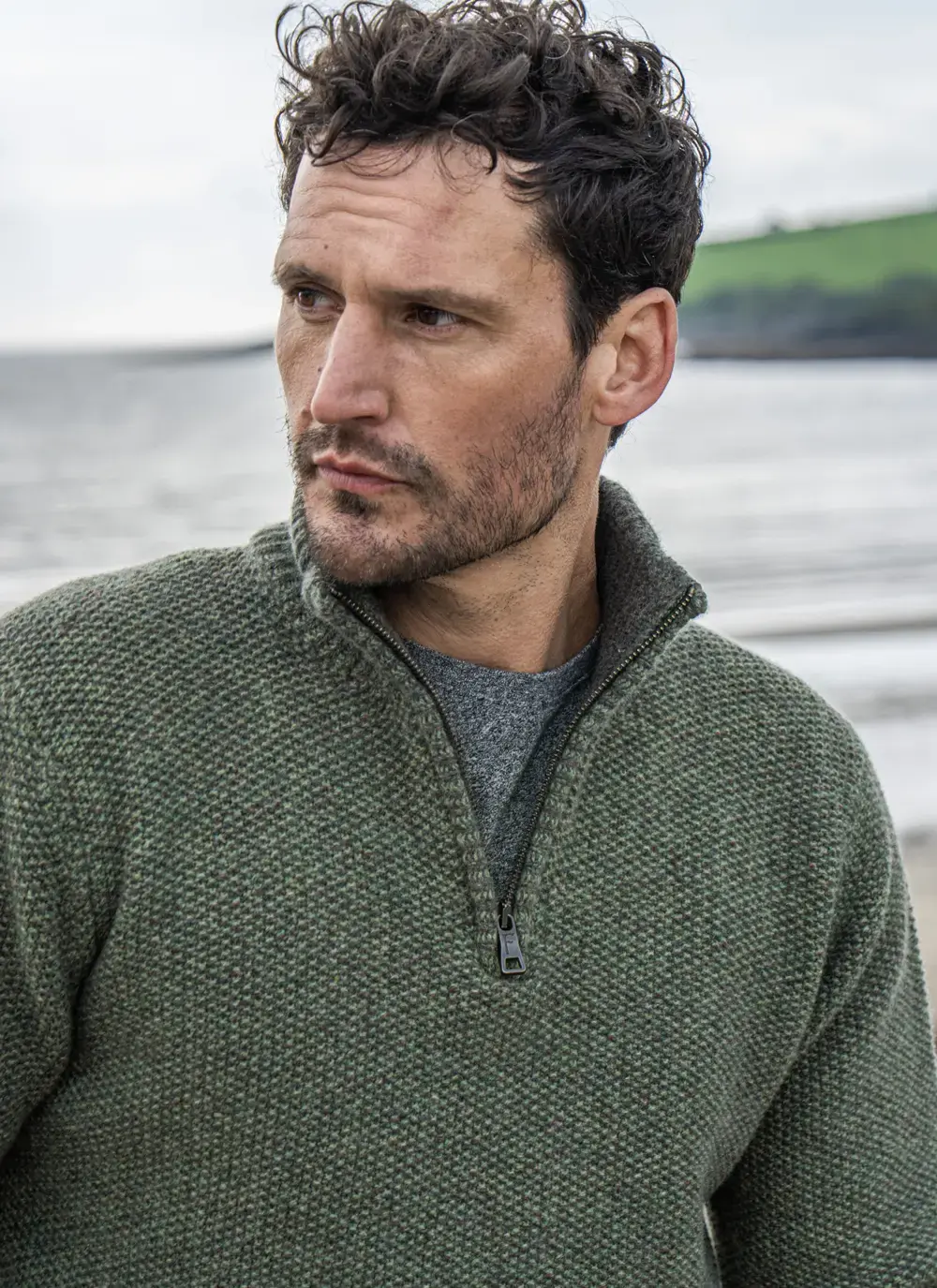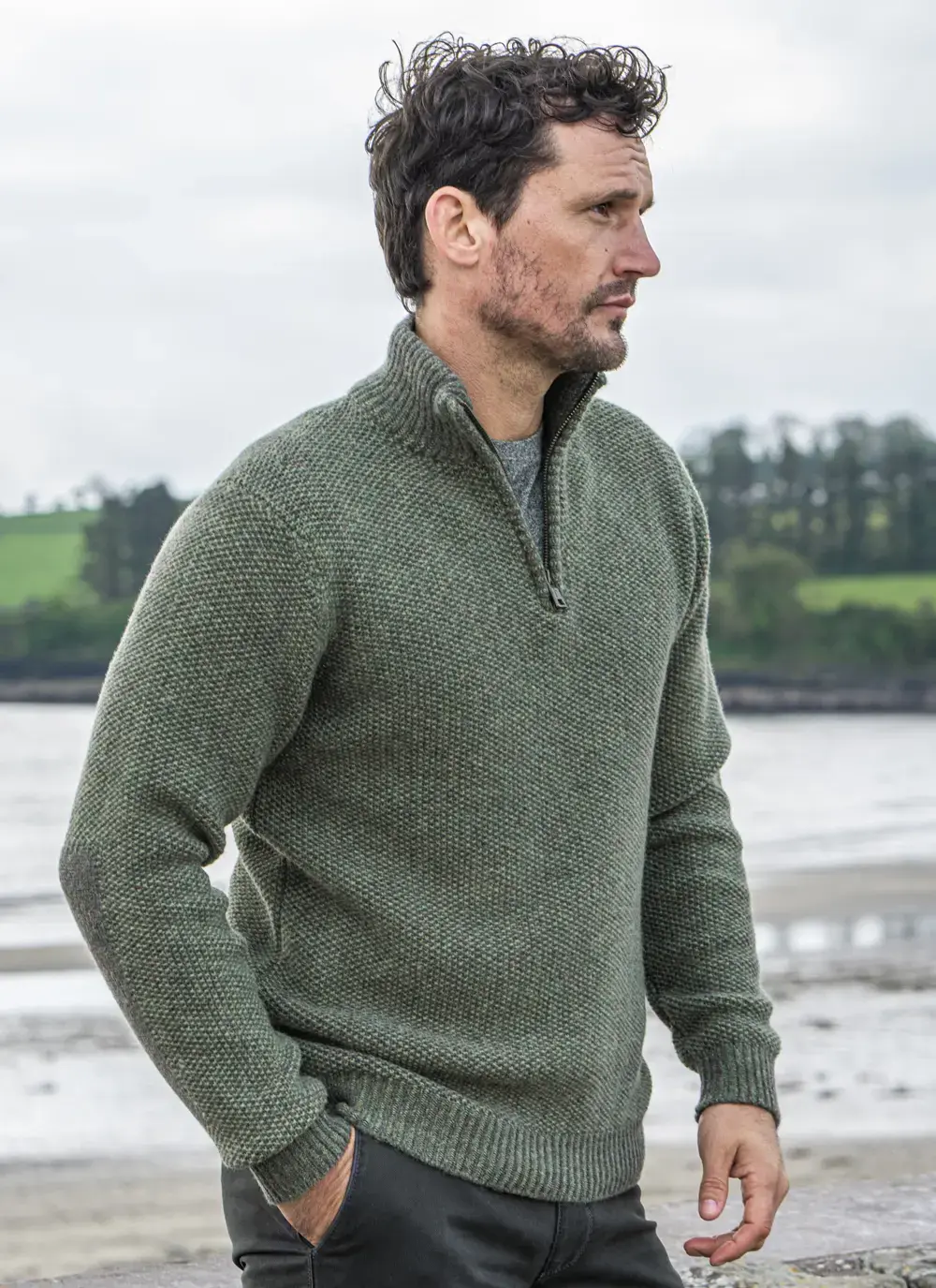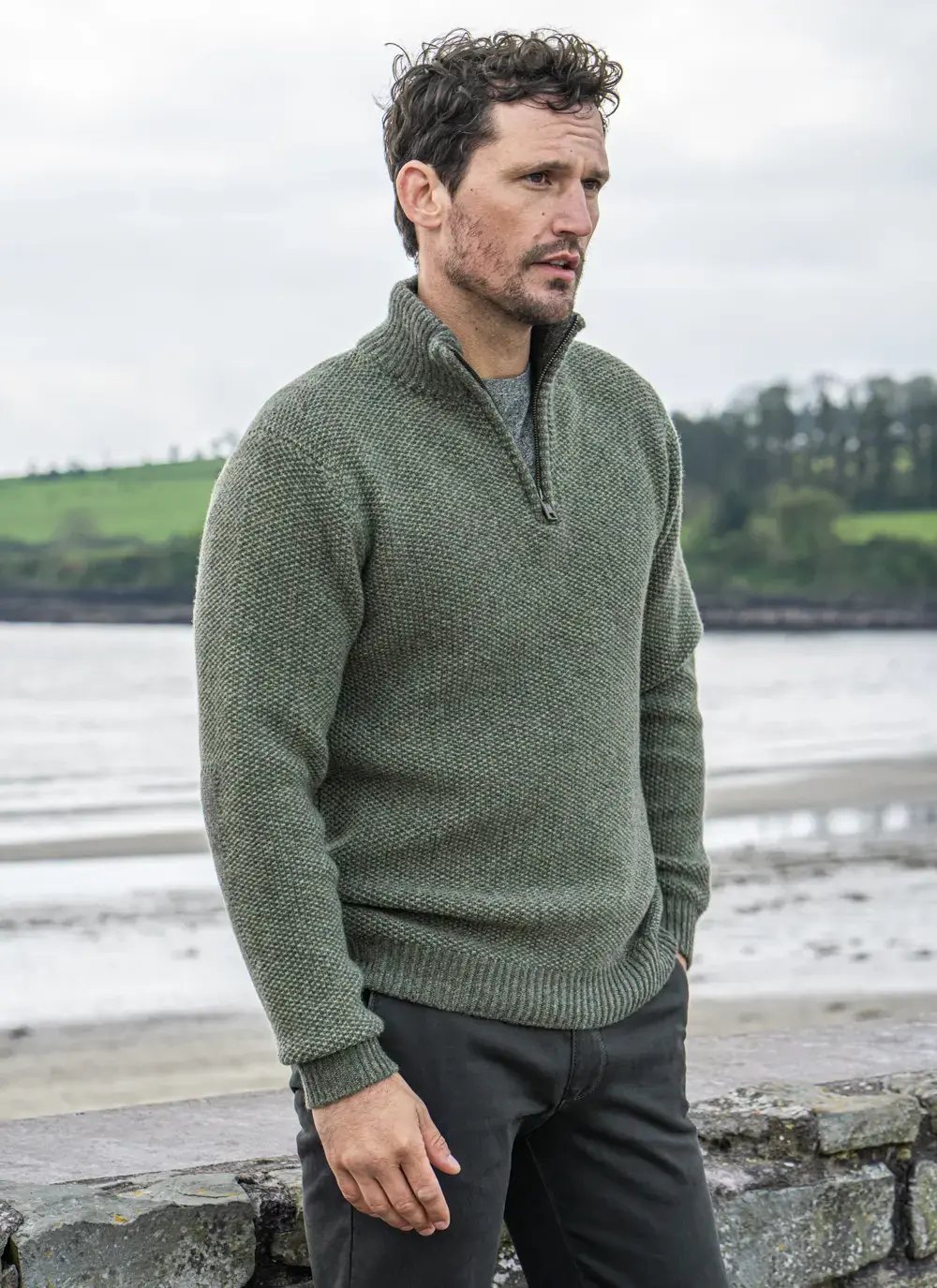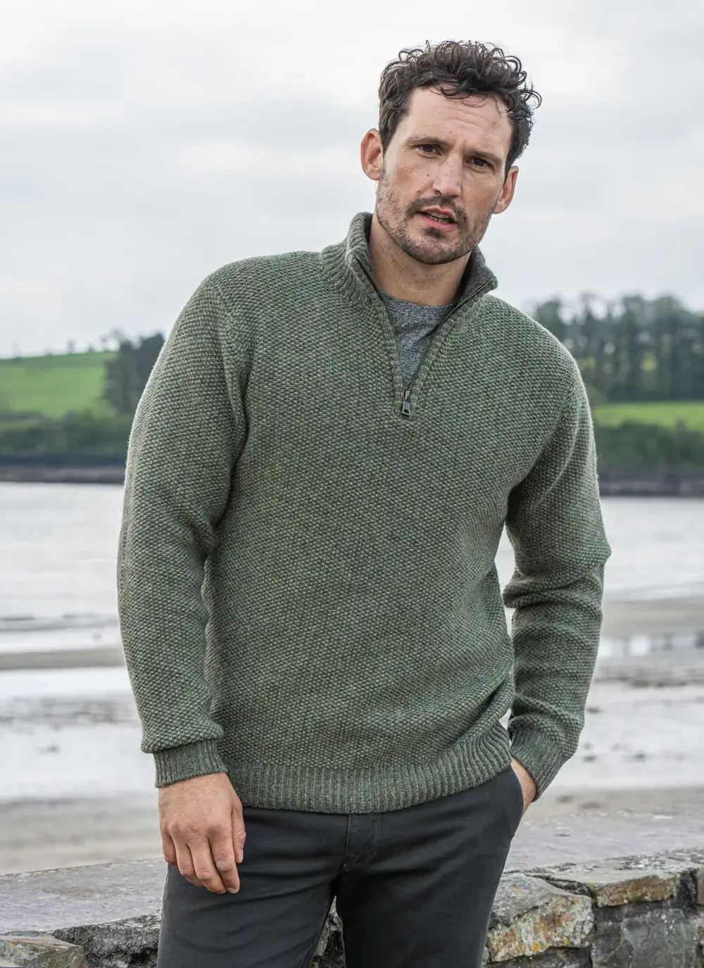Fisherman Lambswool Seed Stitch Zip Neck Sweater