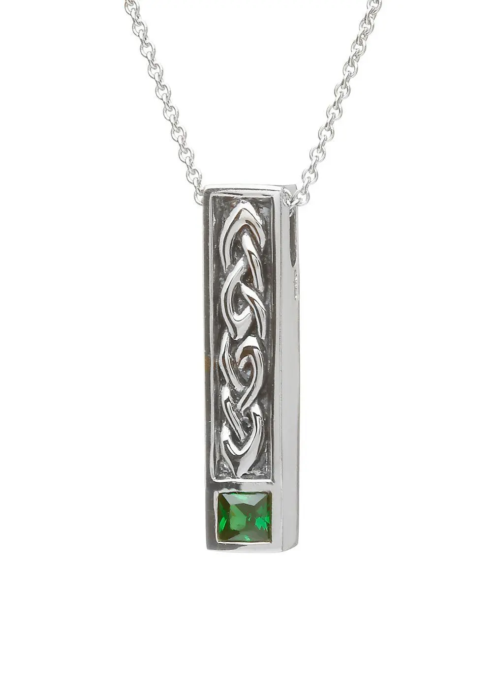 Sterling Silver Celtic Bar Pendant with Green Cubic Zirconia