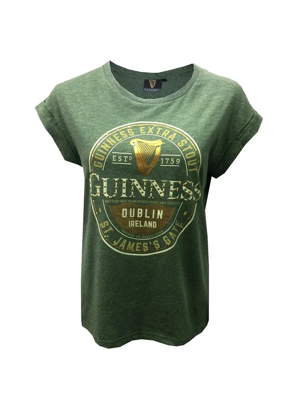 Ladies Guinness Label Moss Green Stud T-Shirt